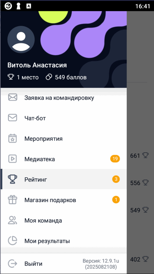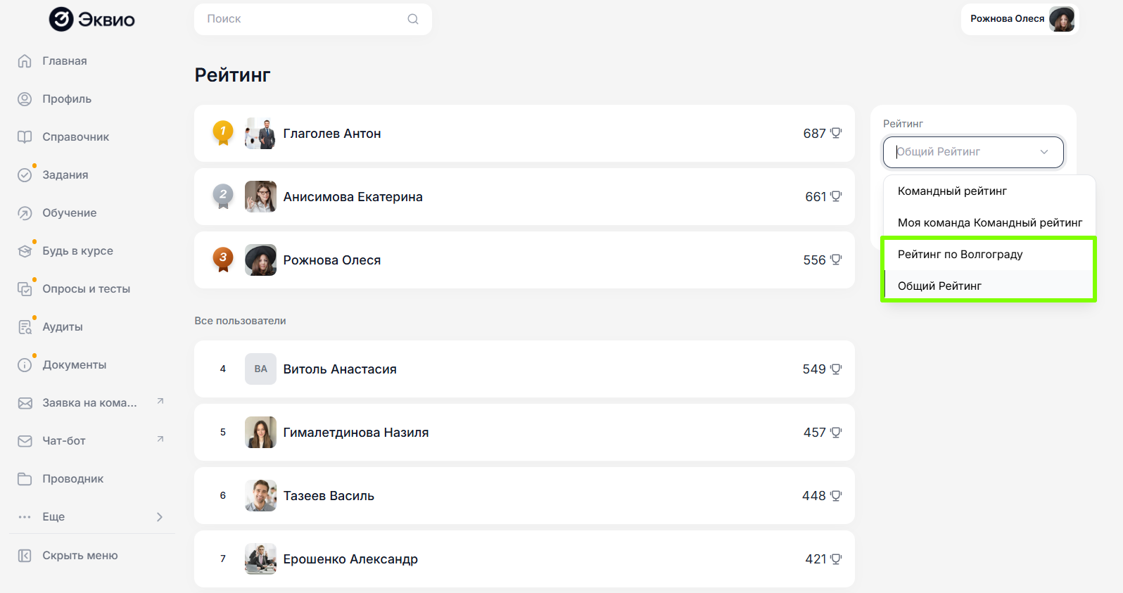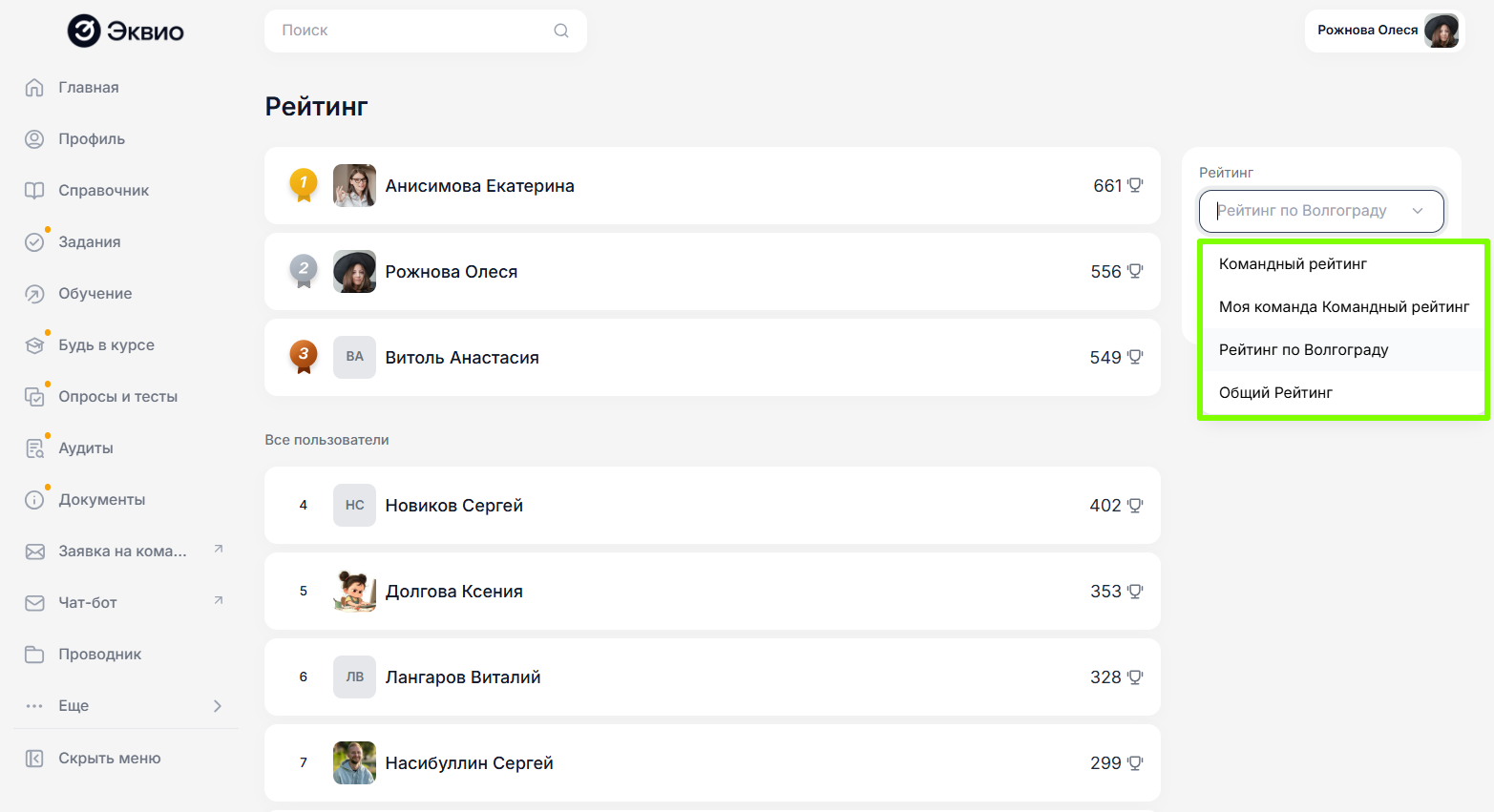 - Командные рейтинги — доступны, если у пользователя есть подчиненные или он входит в команду;