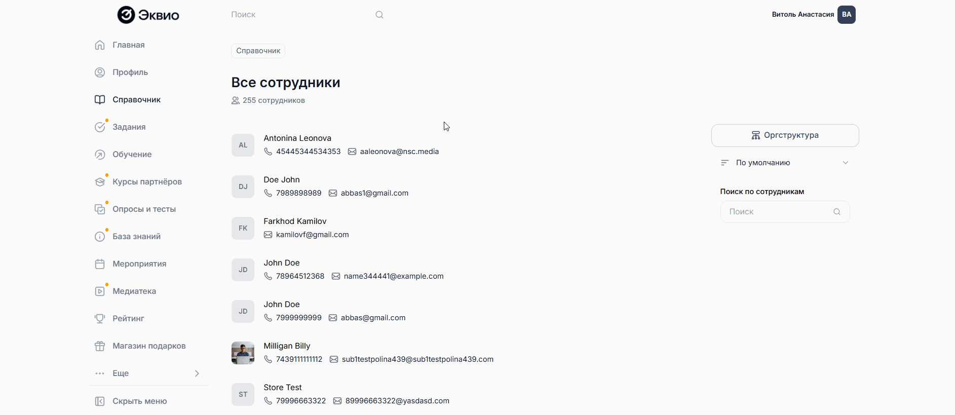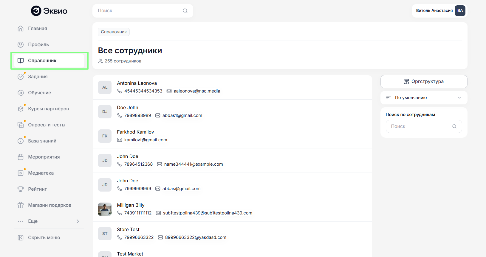 Доступ к этой информации предоставляется каждому сотруднику, обеспечивая прозрачность и открытость внутренней коммуникации. Исключением являются заблокированные учетные записи, которых нет в справочнике, что гарантирует актуальность и конфиденциальность данных.