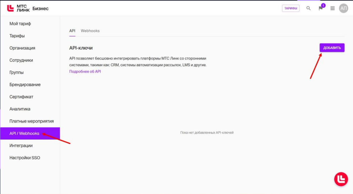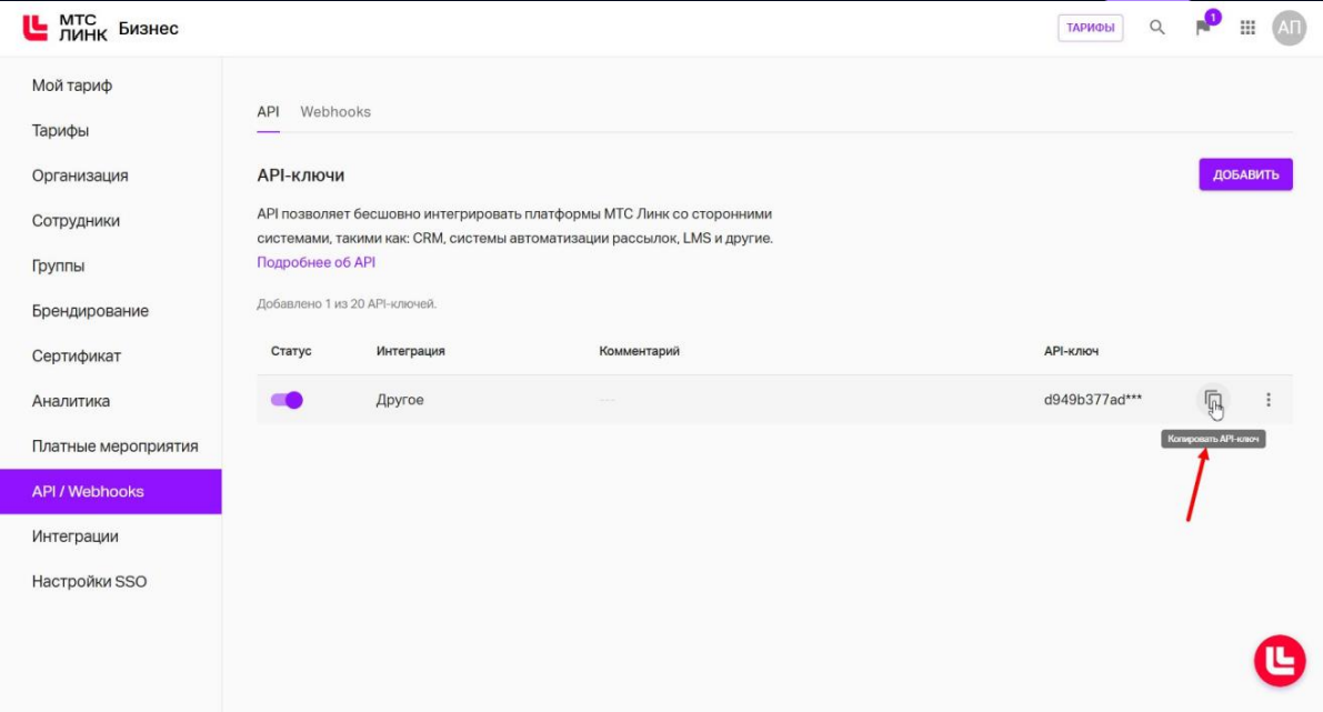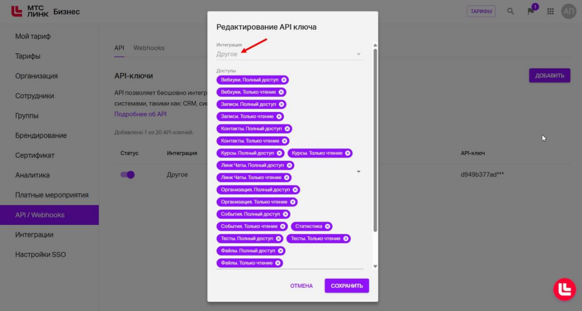 Для настройки интеграции с МТС Линк передайте вашему менеджеру или специалистам службы поддержки API ключ.