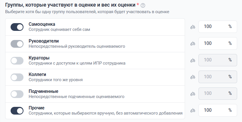 Блок «Группы, участвующие в оценке, и вес их оценки» позволяет настроить группы респондентов, которые будут автоматически добавляться к оцениваемым сотрудникам при их включении в оценочную сессию, а также задать вес оценки каждой группы.