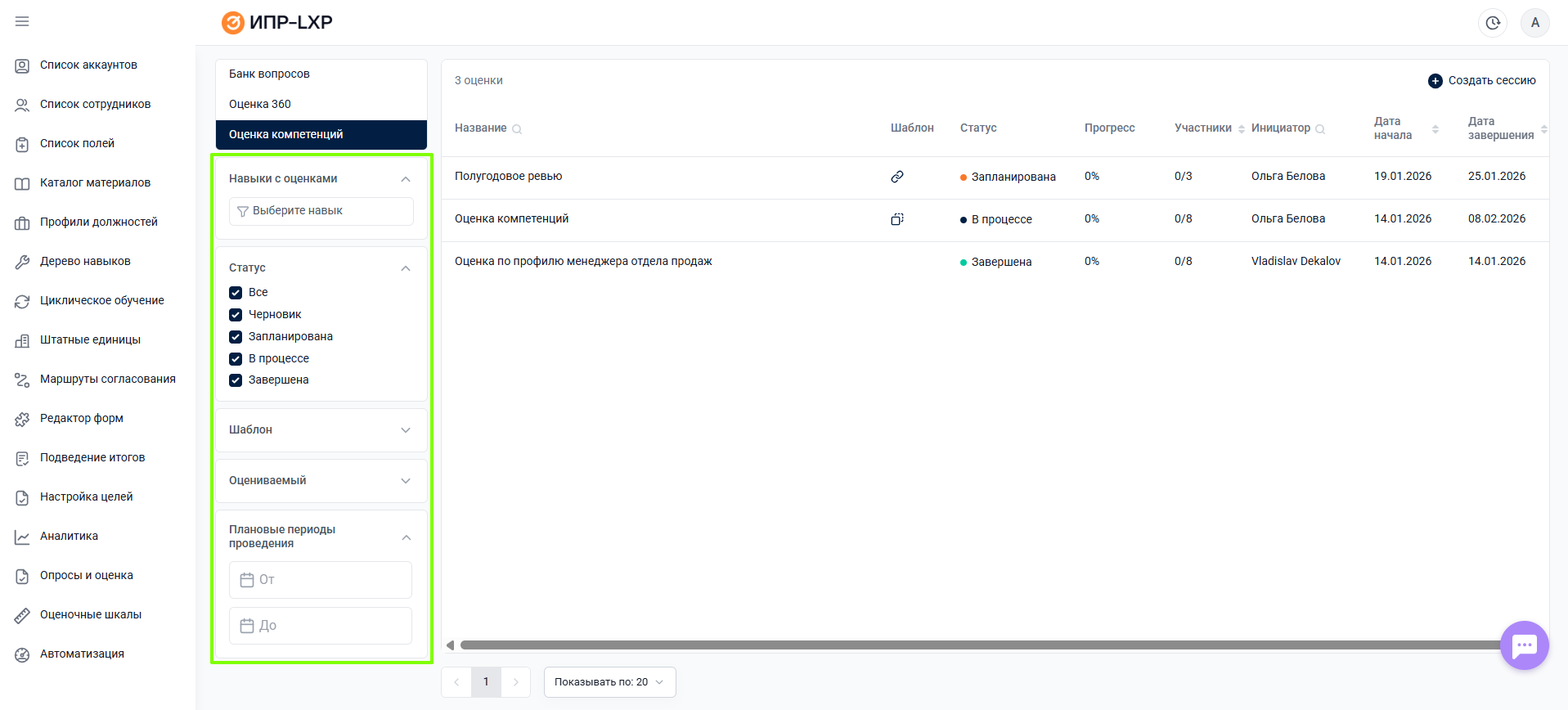 Рассмотрим основные параметры и этапы работы с сессиями оценки компетенций: порядок их создания, настройки и запуска.
