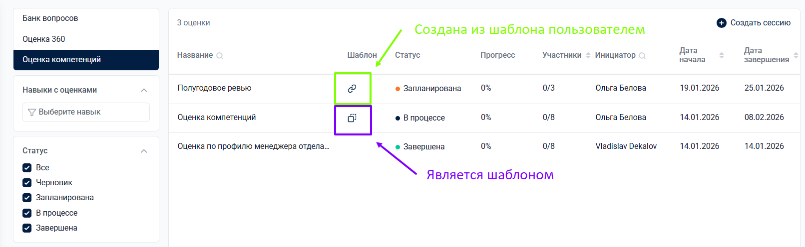 В таблице сессий оценки компетенций в административной панели по значку в столбце Шаблон можно определить, является ли сессия шаблоном (значок копии) или была создана на основе шаблона из пользовательского интерфейса (значок ссылки).