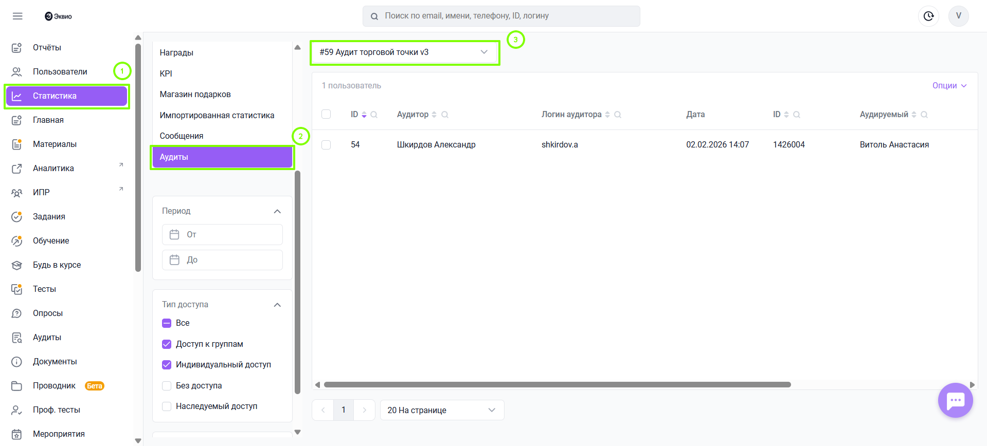 - Без доступа - показывает аудиты, к которым доступ был отозван, но ответы пользователя сохранились в статистике;