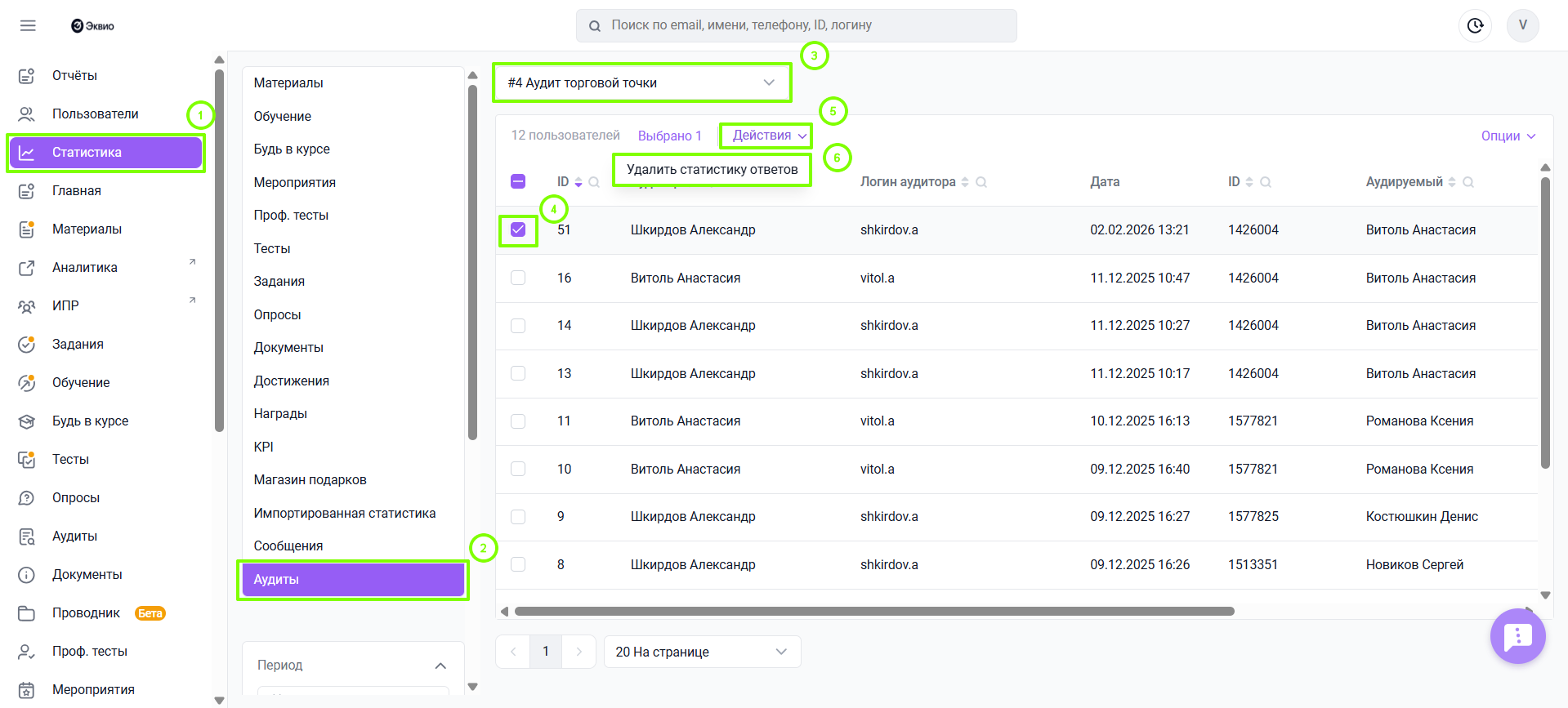При помощи массовых действий в статистике по разделу Аудиты можно удалить статистику по ответу на него. Для этого нужно: