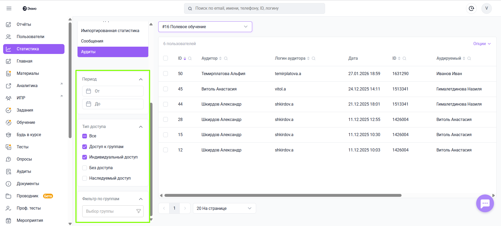 - Доступ к группам - аудит, доступный для прохождения по групповому доступу;