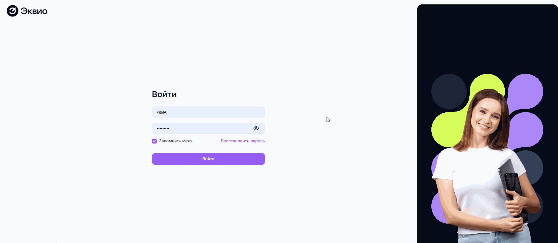 - Войдите в учетную запись пользователя в Эквио;