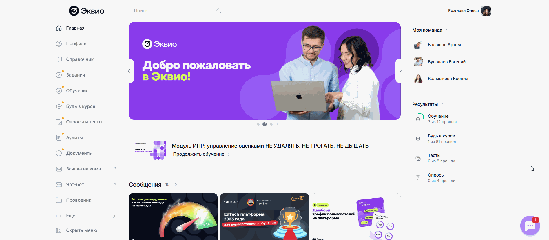 Для работы с материалами, обучением, заданиями, аудитами и иным контентом используется основная платформа Эквио.