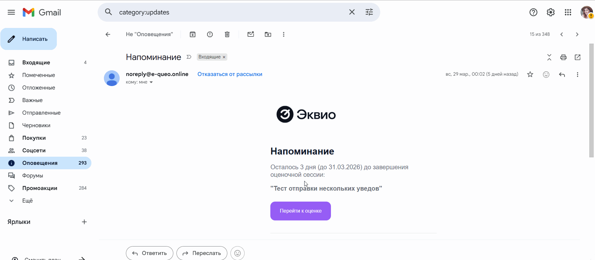 - Откройте письмо с уведомлением по модулю Развитие и оценка;