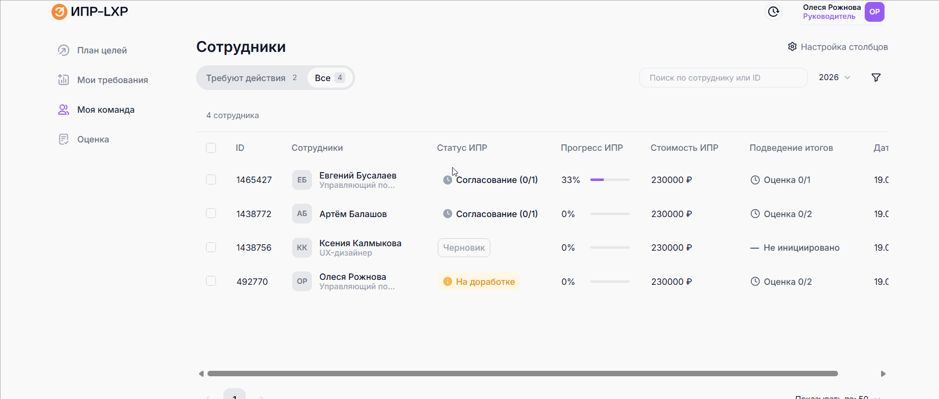 - Найти и нажать нужного сотрудника на вкладке Требуют действий - в таблице отобразятся те сотрудники, ИПР которых требуют согласования от руководителя;