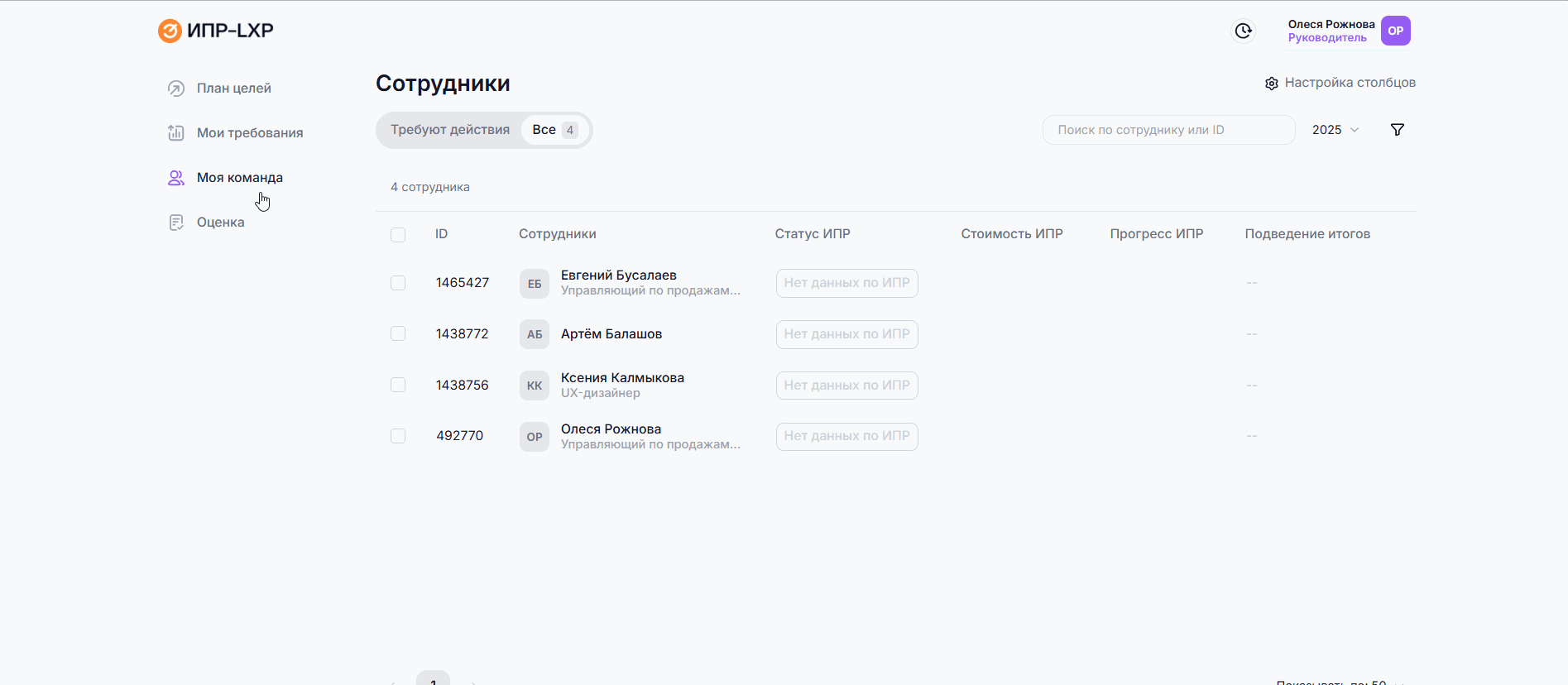 Здесь руководителю отображается список подчинённых, для которых можно просматривать и создавать ИПР.