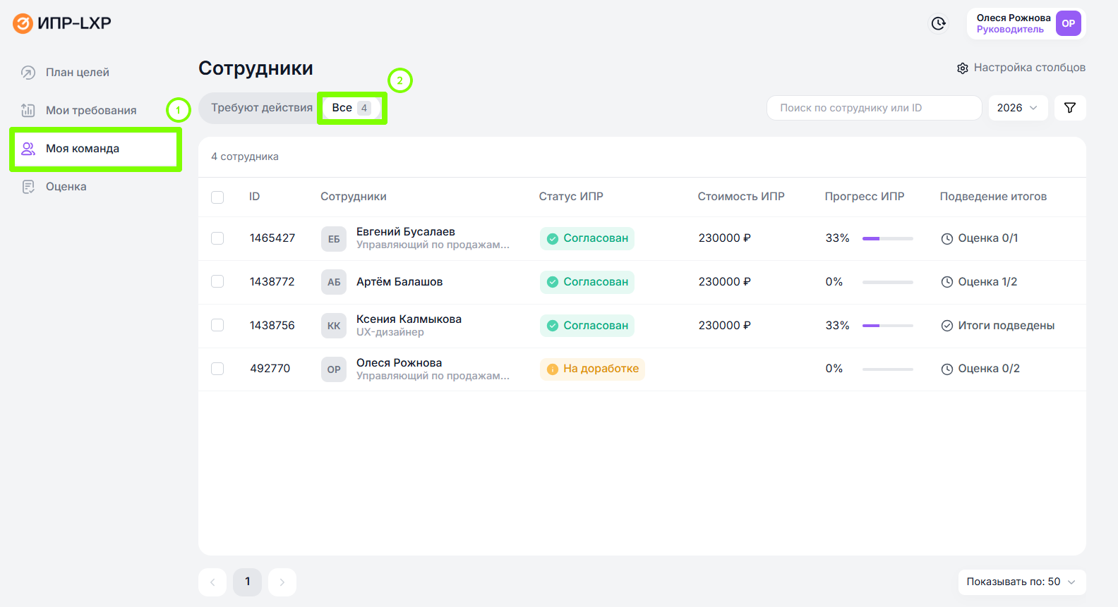 Чтобы перейти в ИПР сотрудника руководителю нужно: